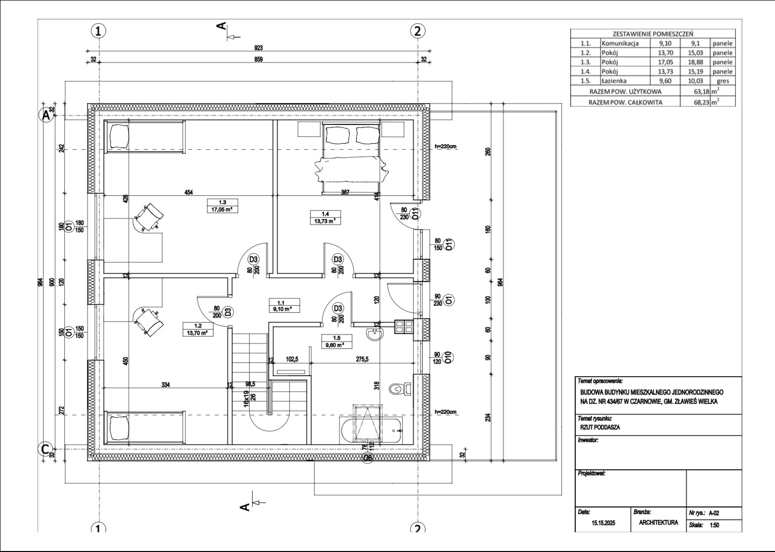 Na poddaszu zaplanowano strefę prywatną z kilkoma pokojami oraz przestrzenią, którą można dopasować do potrzeb domowników.